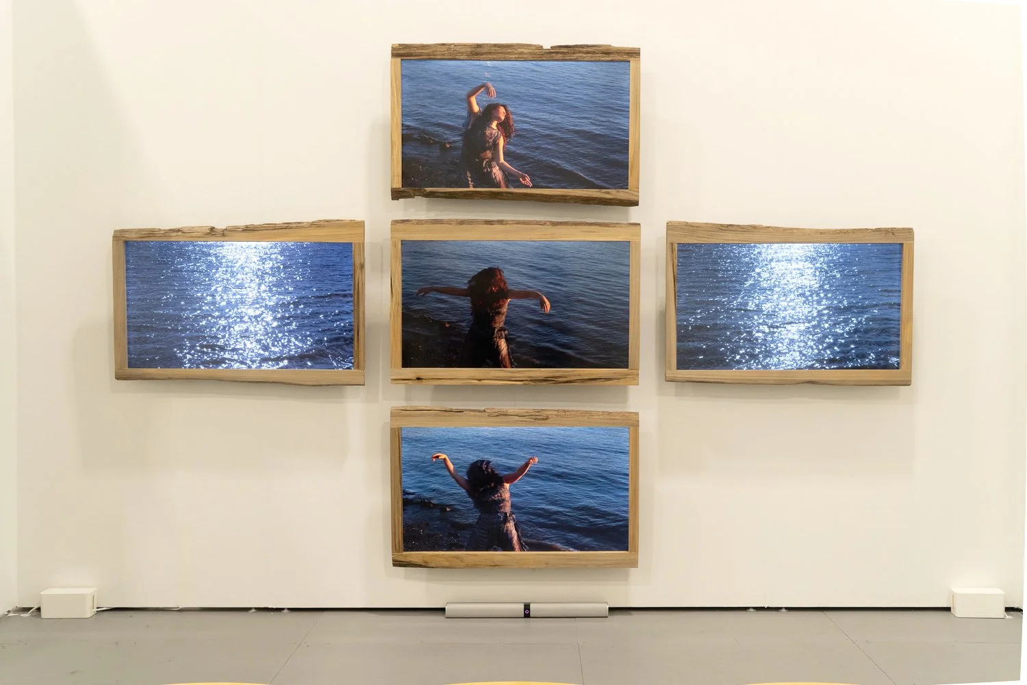 Video installation framed in Mississippi River driftwood, clay, glaze, and pigment prints on aluminum