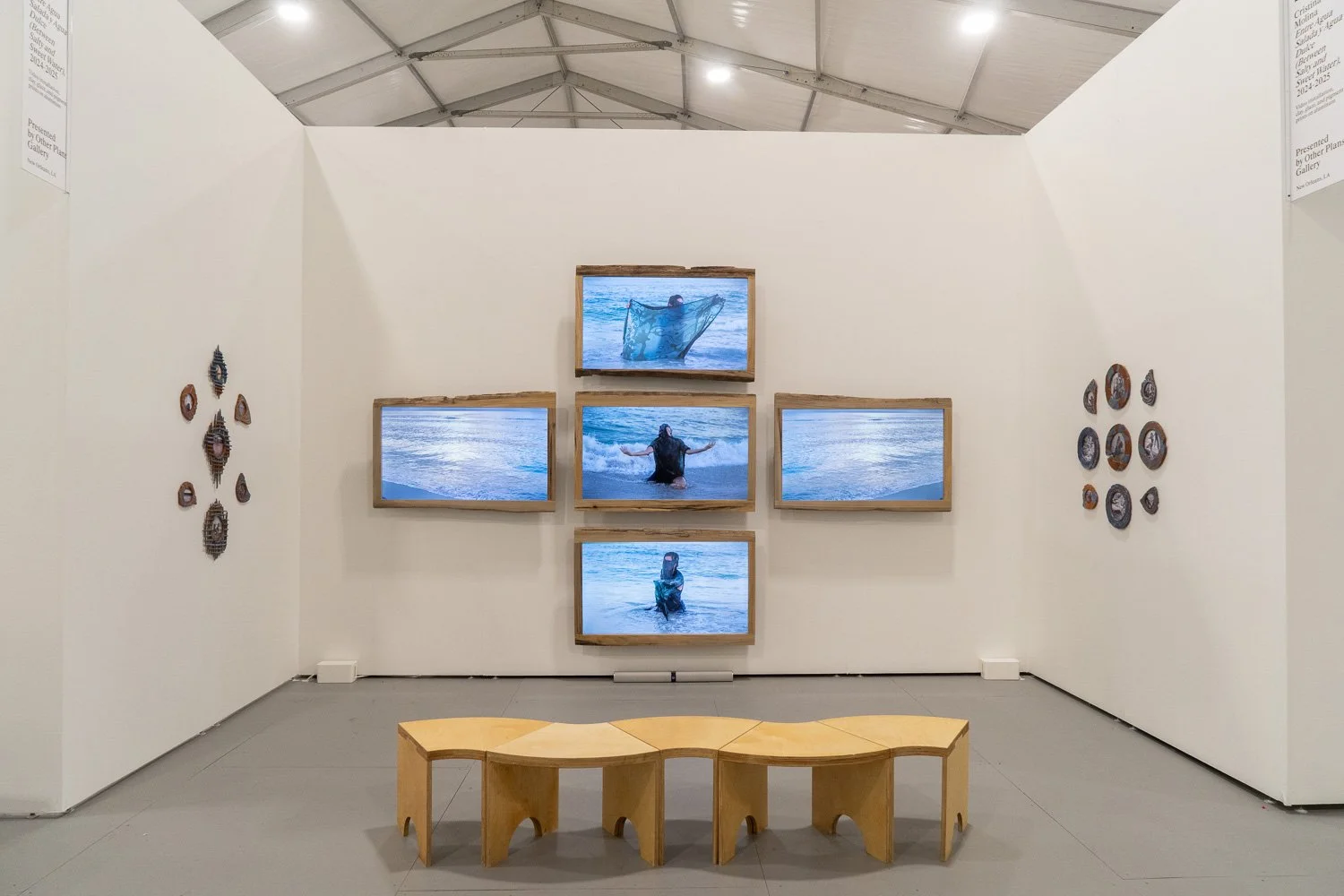 Presented as five-channel video installation and accompanying sculptures made from wild Mississippi River clay and glaze containing still photographs of the water and dancers, Entre Agua Salada y Agua Dulce (Between Salty and Sweet Water) draws parallels between water bodies, spiritual bodies, and physical bodies, and the corporeal water dances serve to symbolically incarnate the contested and celebratory aspects of the River and Ocean’s history and memory.